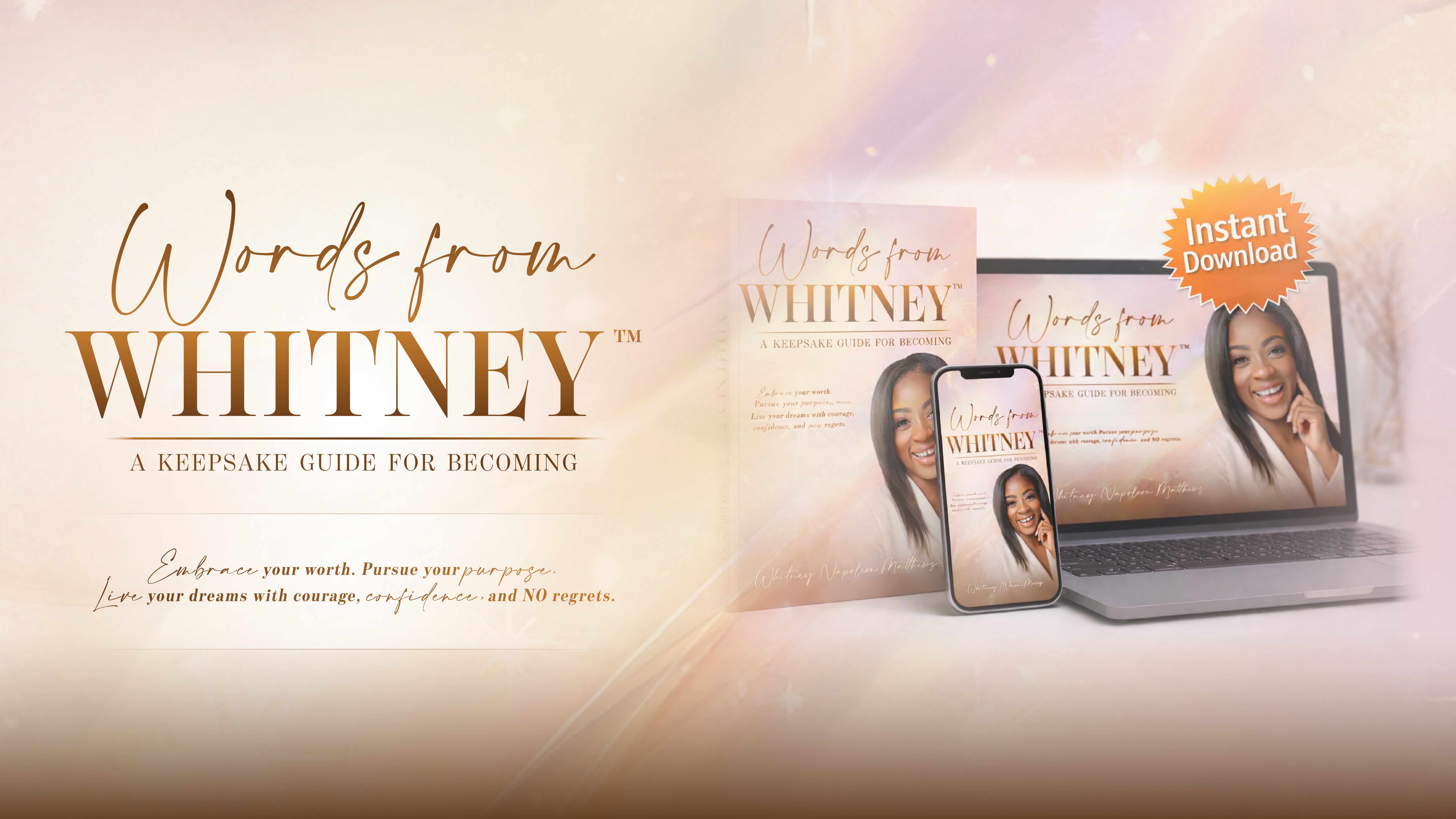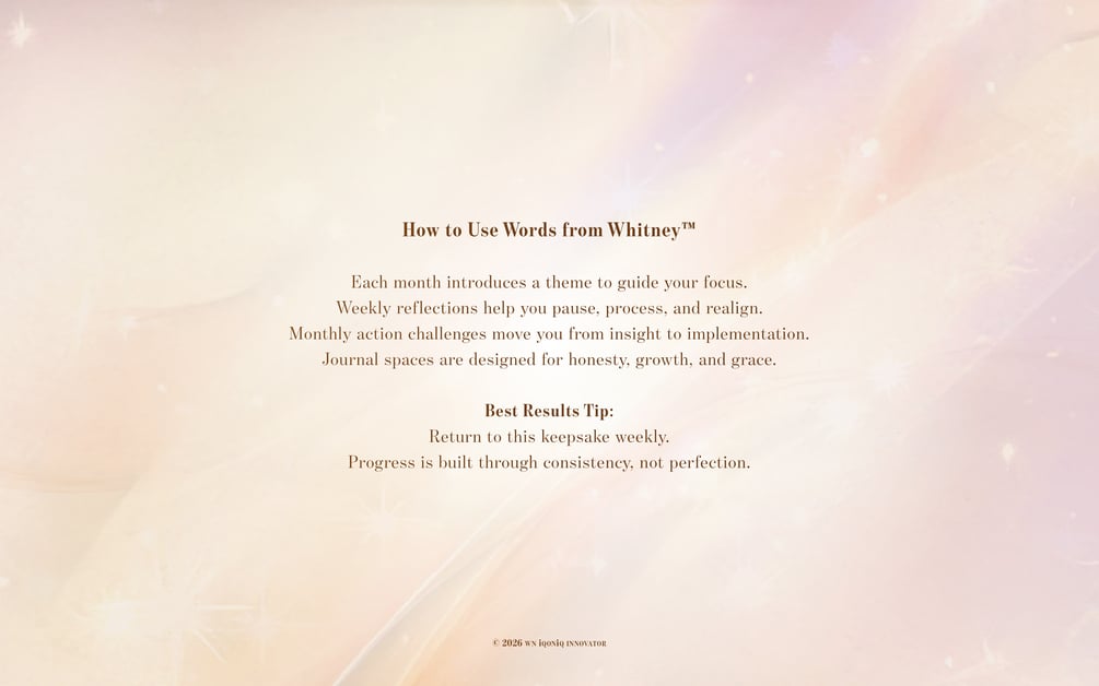 Words from Whitney™ is a 12-month interactive digital keepsake guide created to help you embrace your worth, pursue your purpose, and live with courage, confidence, and no regrets.